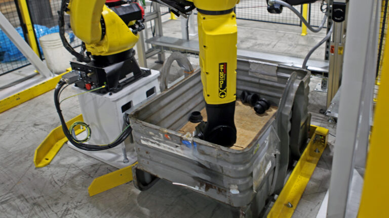 Robotic random bin picking technology allows for containers to be bulk-filled with parts that have just cleared through manufacturing cells. This sort of bin picking technology can send bins to downstream operations, set each bin in place and thus keep the automated manufacturing running smoothly.