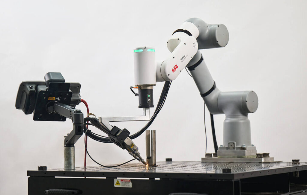 The EasyArc Laser Cart pairs the ABB GoFa™ collaborative robot with the THEO MA1 ULTRA handheld laser welder to deliver: