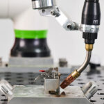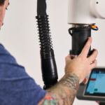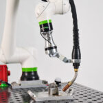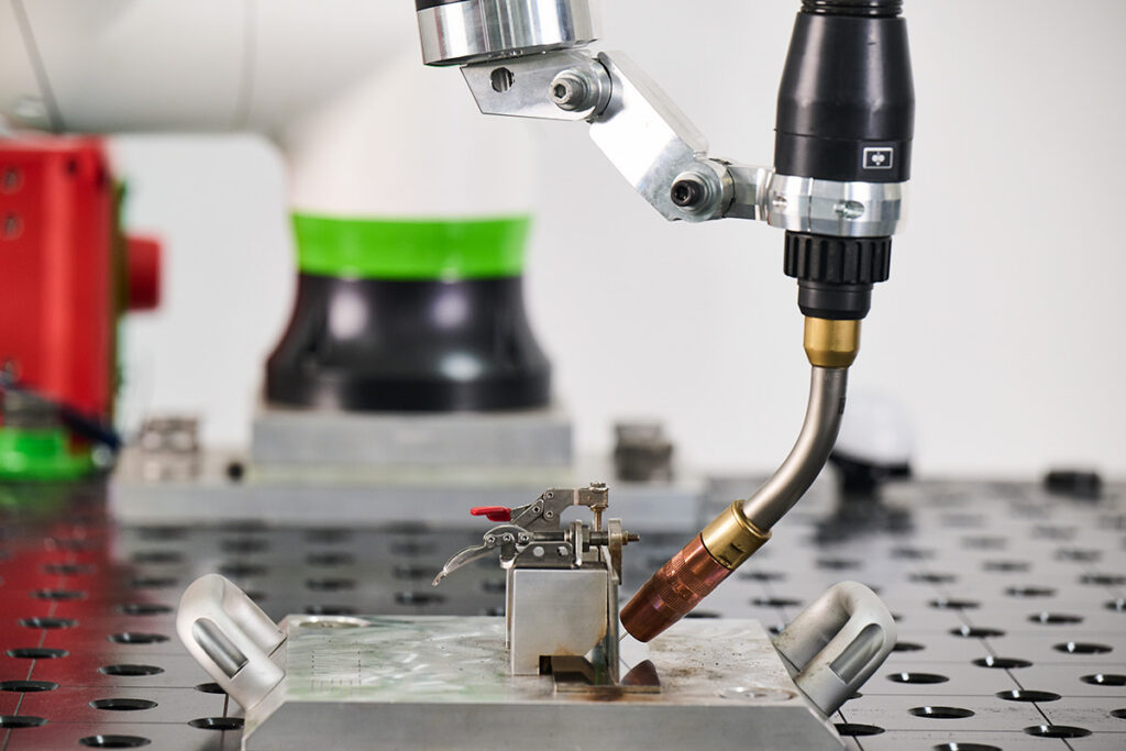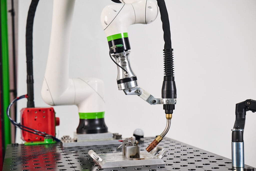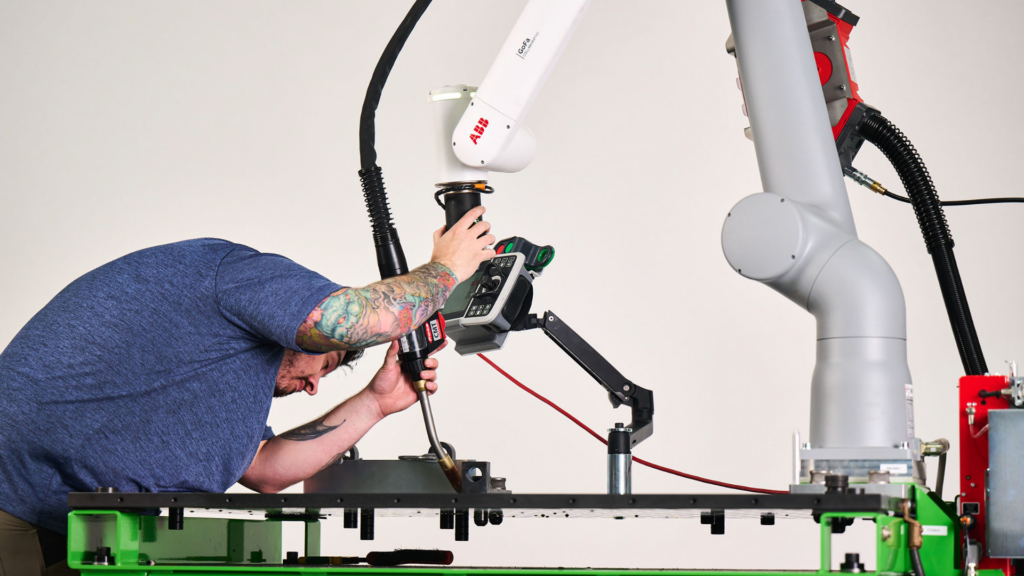 The collaborative robot’s design and operating speeds allow it to work safely alongside operators in most setups without safety fencing. The cart’s locking-caster design makes it easy to reposition across the shop floor to match where work is happening.