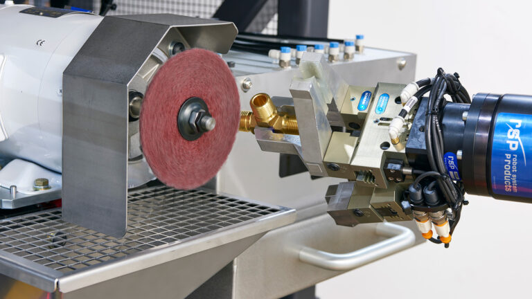 - Robot retrieves finished parts, then routes them through debris blow-off and a deburring station
