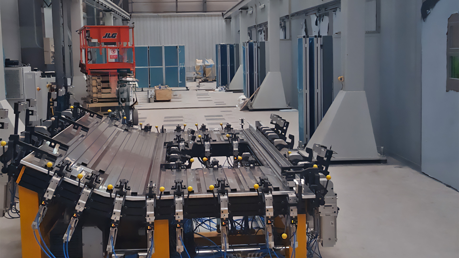 - Operators load stiffeners, window frames, and top/bottom corrugated panels into a clamped top frame