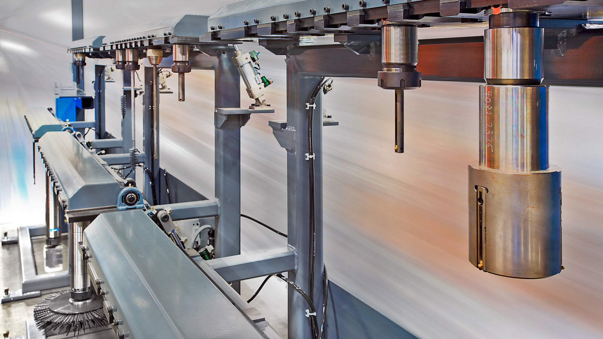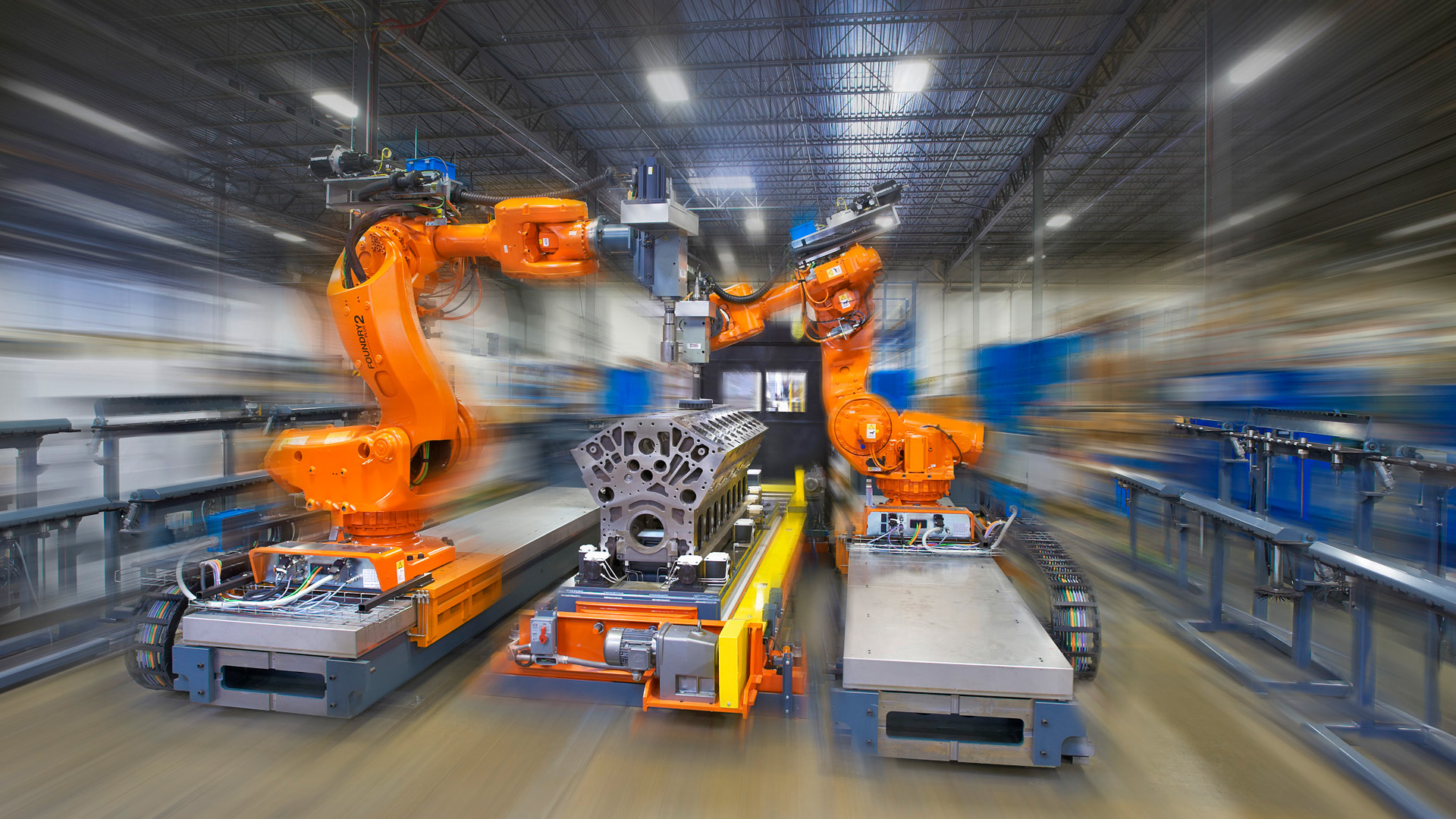 - Automated conveyor systems move engine blocks through enclosed deburring and inspection zones